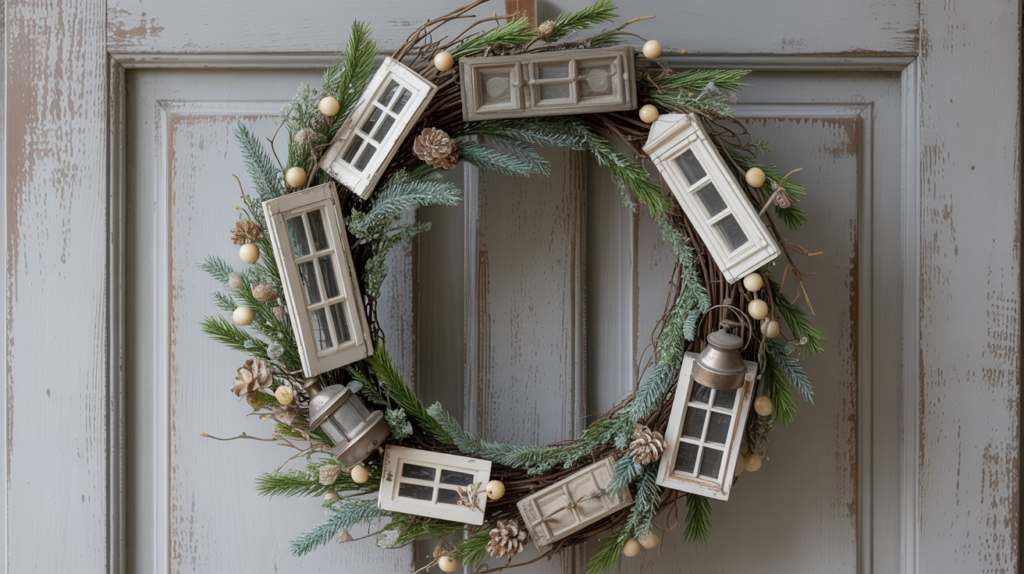 Get creative and use vintage items like old doors, windows, or lanterns to create a unique winter wreath. This look is perfect for those who love to repurpose and upcycle old items.