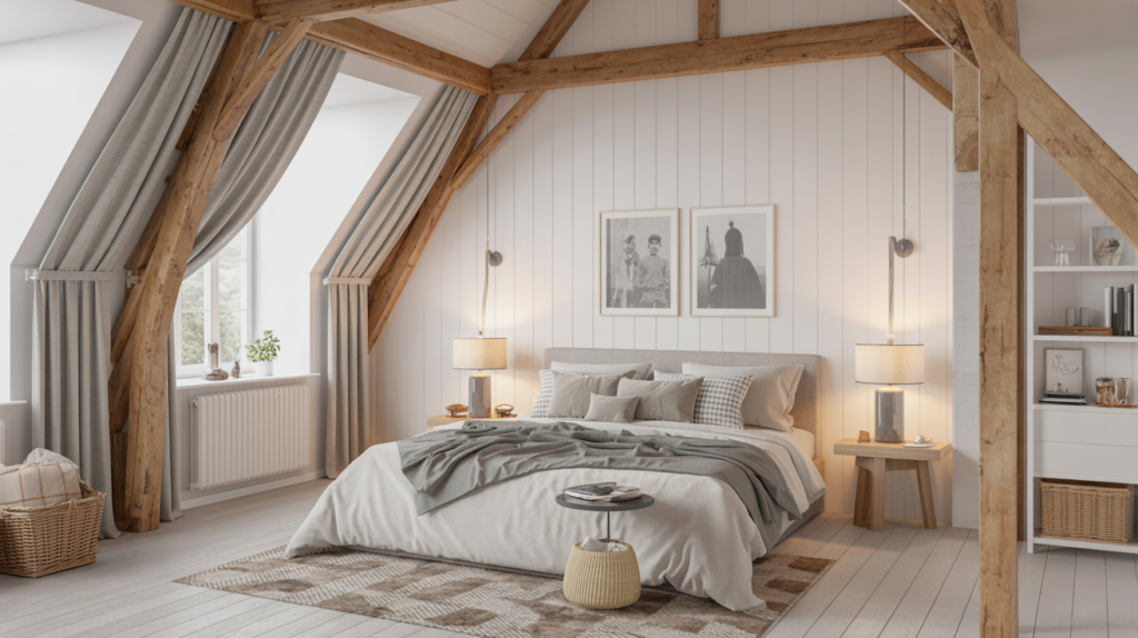 A calming Scandinavian farmhouse bedroom with soft textures and rustic wood features can create a sense of coziness. Exposed beams, shiplap, and cast iron touches can stay, but they work best when balanced with lighter finishes.