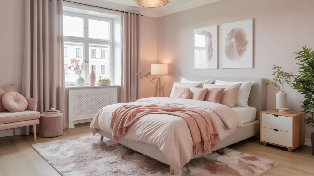 Pink can soften the room and leave everything grounded. Blush and dusty rose work nicely on a headboard, throw, or curtains. Neutral walls and floors keep the room from feeling too sweet or saturated.
