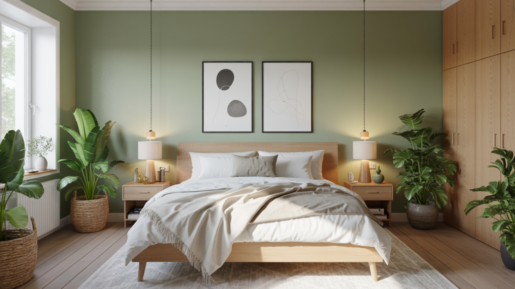 Sage or emerald green can bring in a calm feel while adding a bit of warmth. These tones work particularly well with blonde woods and crisp white bedding. A light-filled Scandinavian bedroom features a wooden bed with pale green and beige bedding, flanked by two large potted plants and a window overlooking trees.