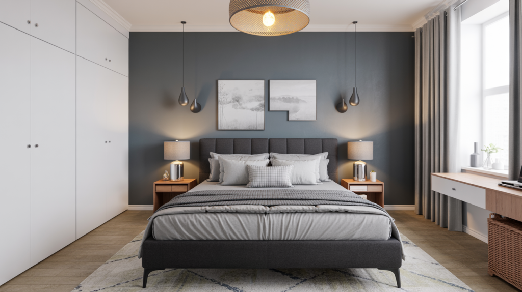 Scandinavian bedrooms handle gray beautifully when the shades are similar. A charcoal bed frame or headboard with dove or slate gray pillows can build depth without making the room feel dark.