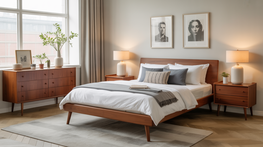 Mid-century furniture or decor can easily blend into Scandinavian bedrooms when you let the shape and materials lead the way. A clean-lined walnut nightstand or a vintage dresser can change the feel of your bedroom.