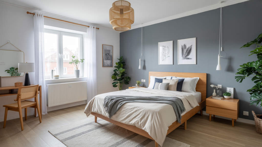 A single accent wall can bring contrast and depth to a Scandinavian bedroom. Soft shades like gray or sage green work especially well. As mentioned before, these tones help keep the room feeling open and give your eyes something to land on.