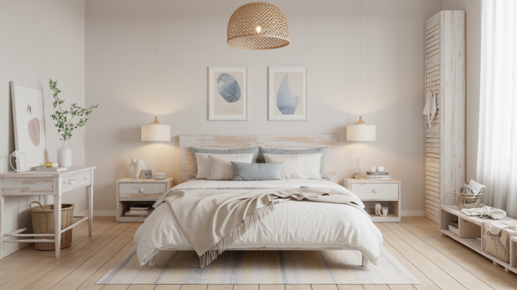 A few coastal touches can bring a breezy feel to a Scandinavian bedroom. Whitewashed furniture and soft linen bedding can create a sense of calm. Pale ocean blues can add a touch of color without overwhelming the space.