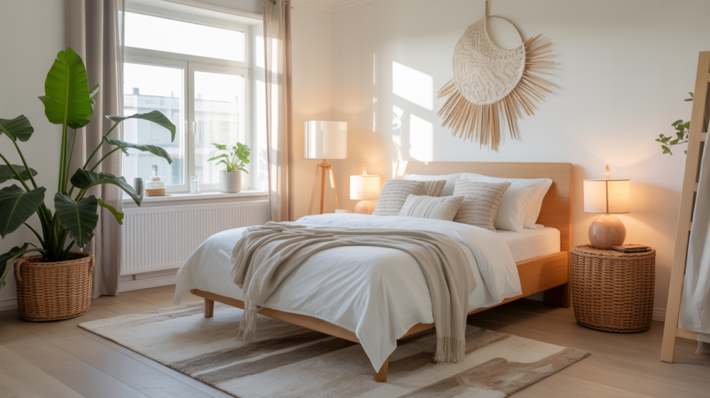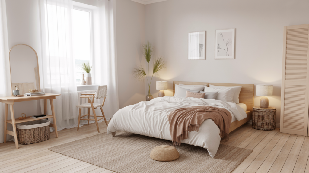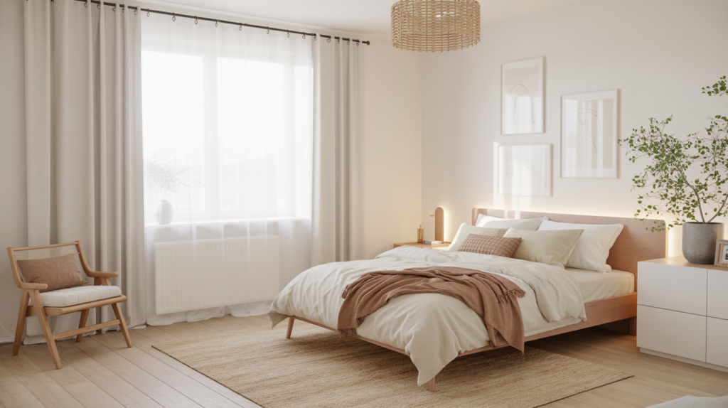 A light-filled Scandinavian bedroom with white walls, pale wood furniture, and a natural fiber rug can bring in warmth without weighing anything down. Sheer curtains help make the most of natural light, keeping everything light and easy.