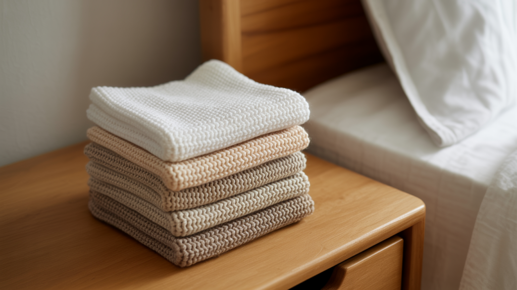 Light, neutral colors are the foundation of any Scandinavian room. A neatly folded stack of five knitted face cloths in various shades of cream and beige can add a touch of warmth to the room.