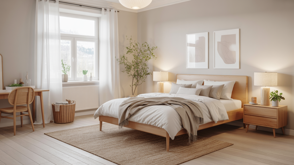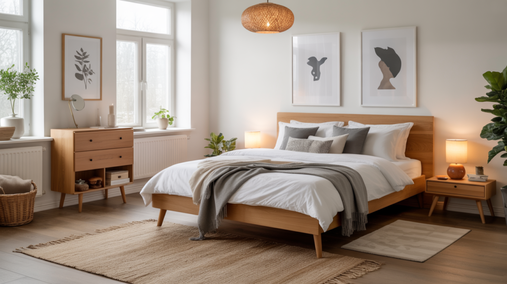 Natural light is crucial in Scandinavian design. A light-filled Scandinavian bedroom with a wooden bed, pale wood furniture, and a natural fiber rug can create a sense of warmth and coziness.