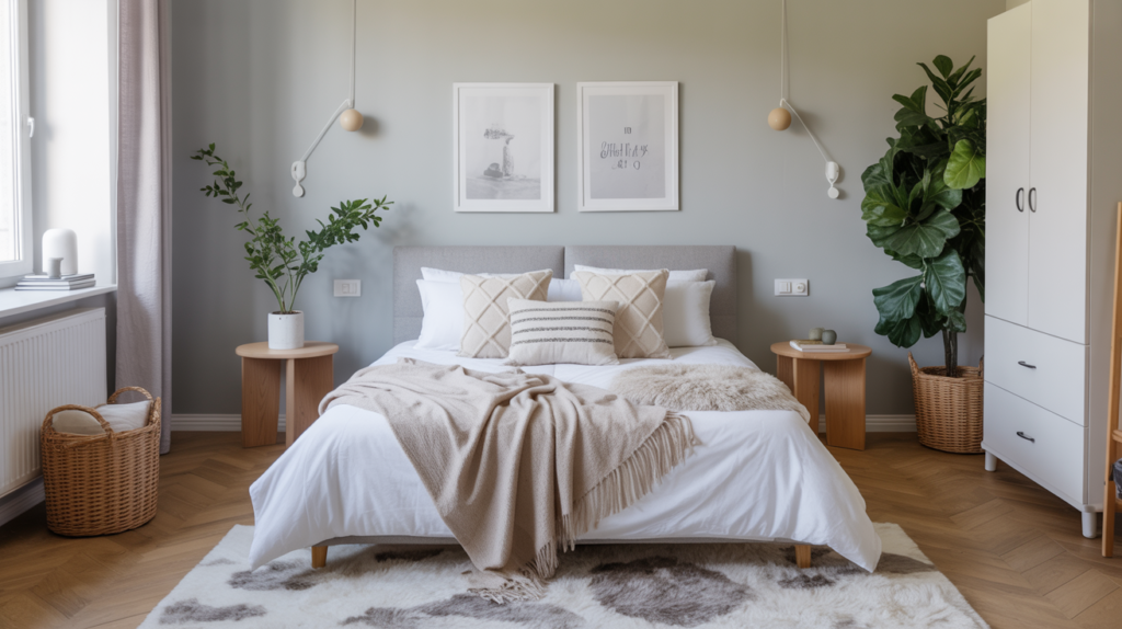 Cozy textiles such as throw blankets, rugs, and pillows can add warmth and texture to a Scandinavian bedroom. A soft, cool gray on the walls can help keep the look airy and calming.