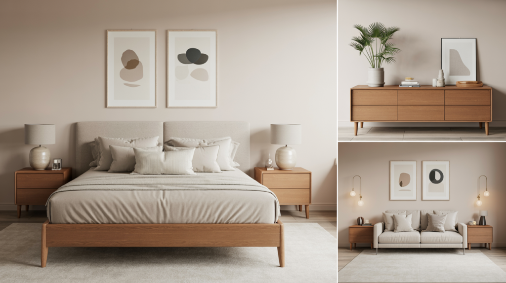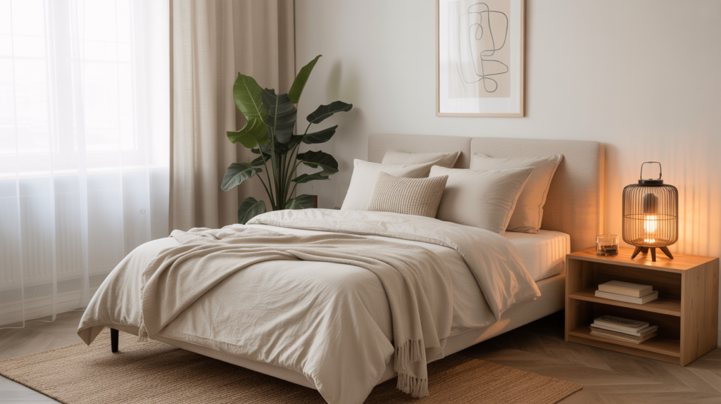 Warm wood tones paired with clean lines can bring just enough contrast without complicating the look. A bedroom with beige bedding, multiple pillows, a leafy plant, a lantern-style lamp, and a framed abstract line drawing above the bed can create a cozy atmosphere.