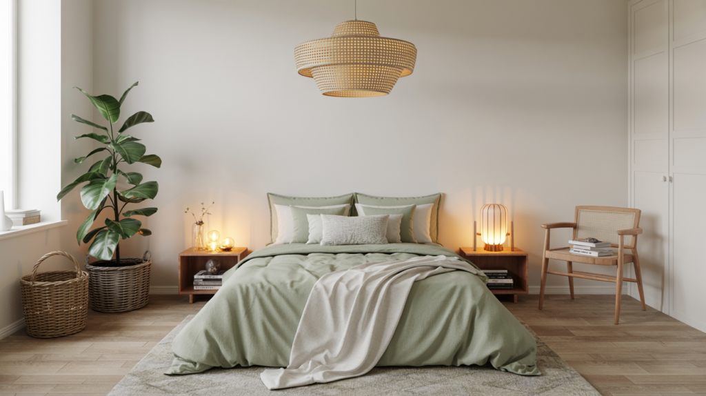 Earthy tones such as soft browns, clay, sand, taupe, and forest green can bring depth to a Scandinavian bedroom. A bedroom with sage green bedding, a large potted plant, a wicker basket, a wooden chair with books, a warm-lit lantern-style lamp, and a framed abstract line drawing on the wall can create a sense of warmth.