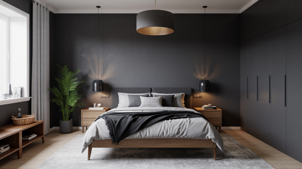 Scandinavian style doesn’t always have to stay light and airy. Deep charcoal or soft black walls can shift a room into a more dramatic and restful aesthetic. Matte finishes over anything glossy can help absorb light and make the space feel grounded.