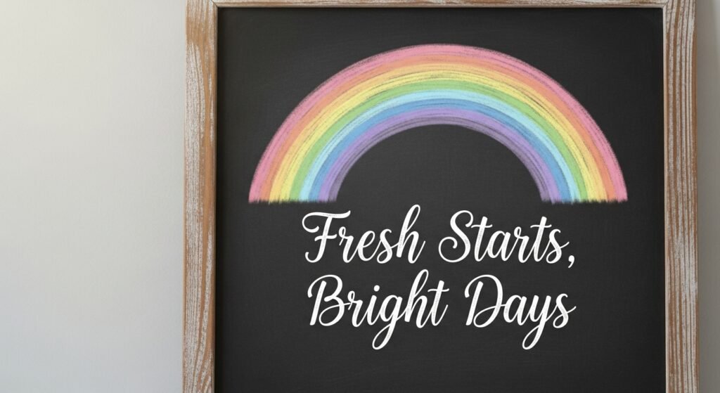 Draw a soft pastel rainbow arched over the phrase “Fresh Starts, Bright Days” for a whimsical touch to your spring decor.