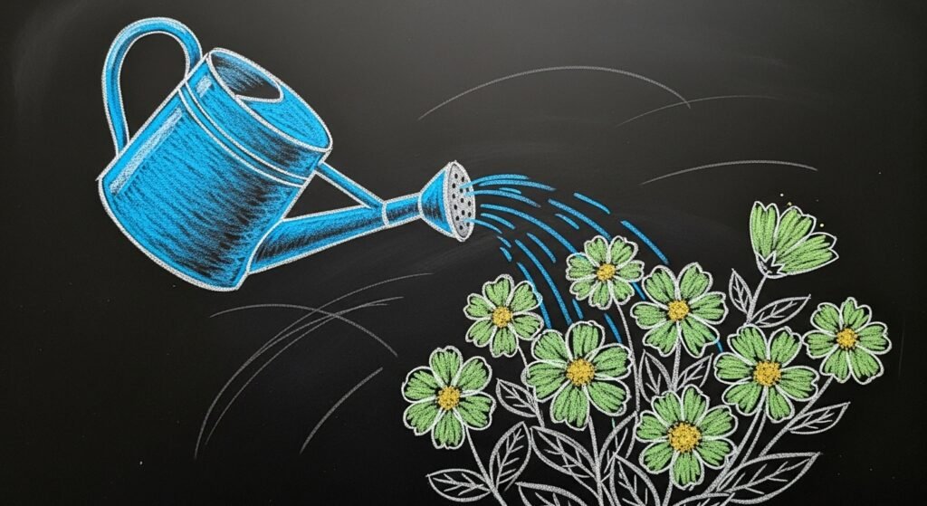 Drawing a watering can pouring over flowers is effortless and easy to do. Use bright blues and greens to make it pop and add a gardening theme to your chalkboard.