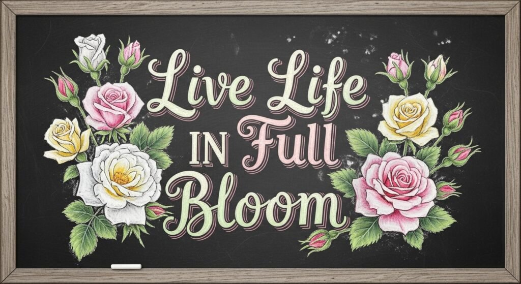Sketch delicate roses blooming around the text “Live Life in Full Bloom” for a lovely reminder to embrace life’s beauty. Layering chalk colors can create realistic rose petals, and use darker shades near the center for depth.