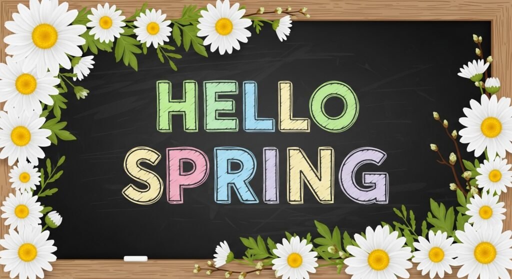 Write “Hello Spring” in bold, playful letters and surround it with a garland of daisies. These cheerful flowers are simple to draw and instantly brighten up your space, making it a great addition for your front porch decoration.