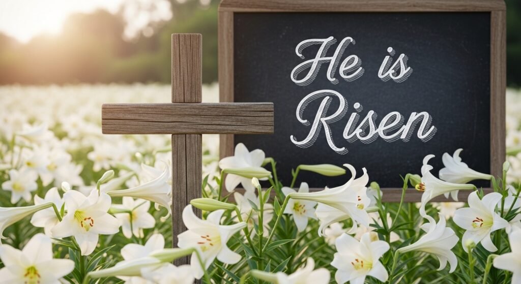 16. “He is Risen” with a Cross and Lilies