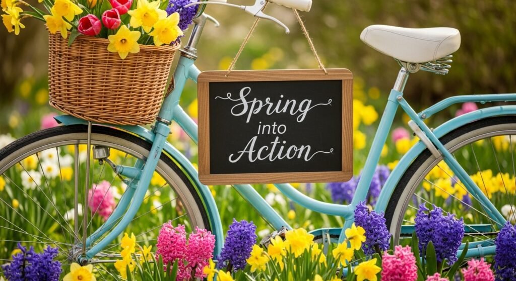 Illustrate a bicycle surrounded by flowers, accompanied by the phrase “Spring into Action.” This design is perfect for encouraging activity and outdoor fun during the spring season.