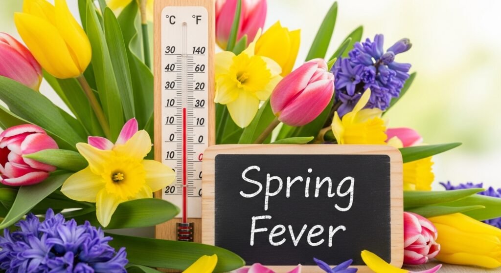 Illustrate a thermometer surrounded by flowers, accompanied by the phrase “Spring Fever.” This design is perfect for capturing the excitement and energy of the spring season.
