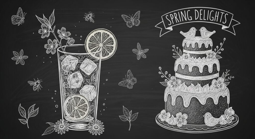 Draw spring-inspired food and drink illustrations, such as lemonade and flowers or a spring-themed cake. Use bright and pastel colors to make it pop and add a touch of spring to your chalkboard.