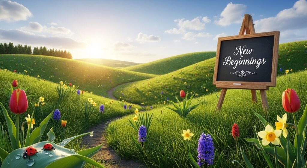 Illustrate a spring landscape, accompanied by the phrase “New Beginnings.” This design is perfect for capturing the fresh start and new beginnings that come with the spring season.