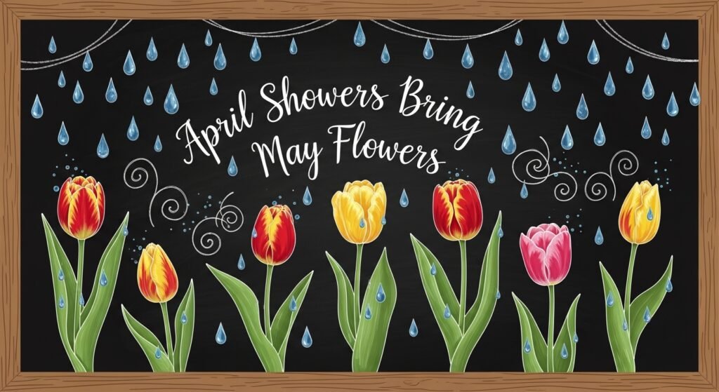 1. “April Showers Bring May Flowers” with Raindrops and Tulips