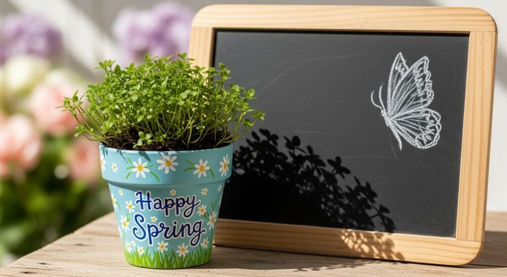 Draw a buzzing bee surrounded by honeycomb shapes and write the words “Bee Happy.” Keep the honeycomb pattern neat for a polished look and add a cute touch to your spring decor.