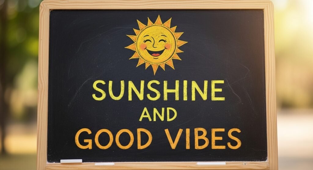 Let your chalkboard radiate positivity with a smiling sun and the words “Sunshine and Good Vibes.” Use yellow and orange chalks to capture the sun’s radiance and add short rays around the sun for a glowing effect.