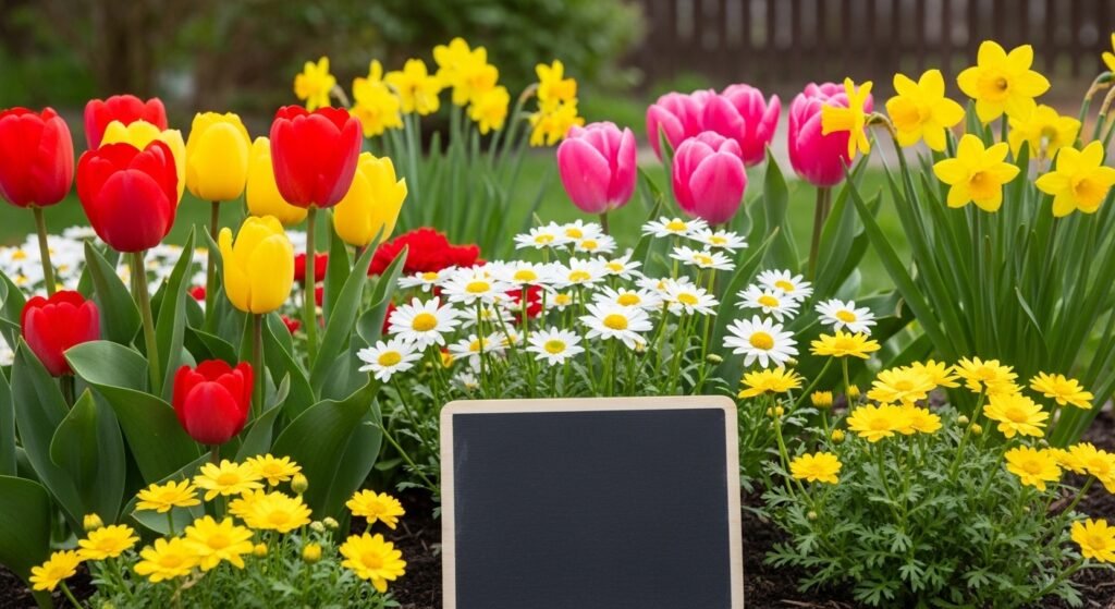 A flower garden filled with tulips, daisies, and daffodils is a bright and cheerful way to capture the season’s vibrancy. Vary the flower heights to create a dynamic composition.