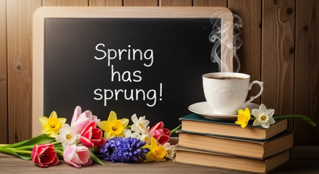 Combine a steaming cup of coffee with blooming flowers for a cozy spring-inspired vibe. The text “Wake Up and Smell the Flowers” ties it all together. Use brown chalk for the coffee and pastel shades for the flowers.