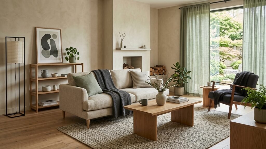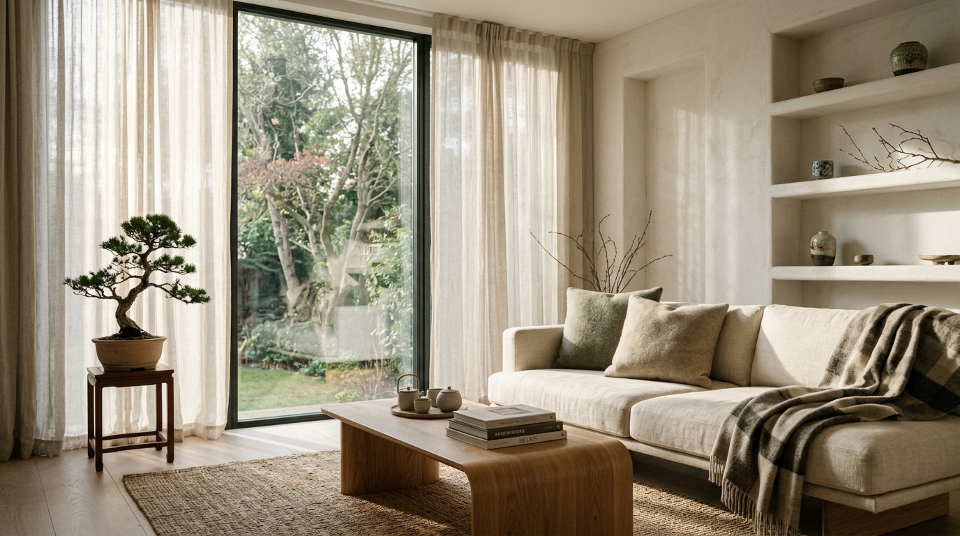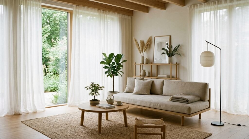 Sheer curtains are a staple in Japandi design, allowing soft, filtered light to enter your living room. They also help to create a sense of separation between indoors and outdoors, promoting a feeling of calm and serenity.