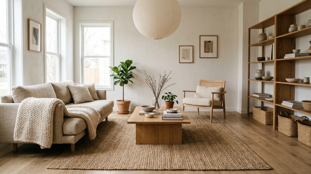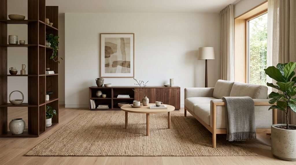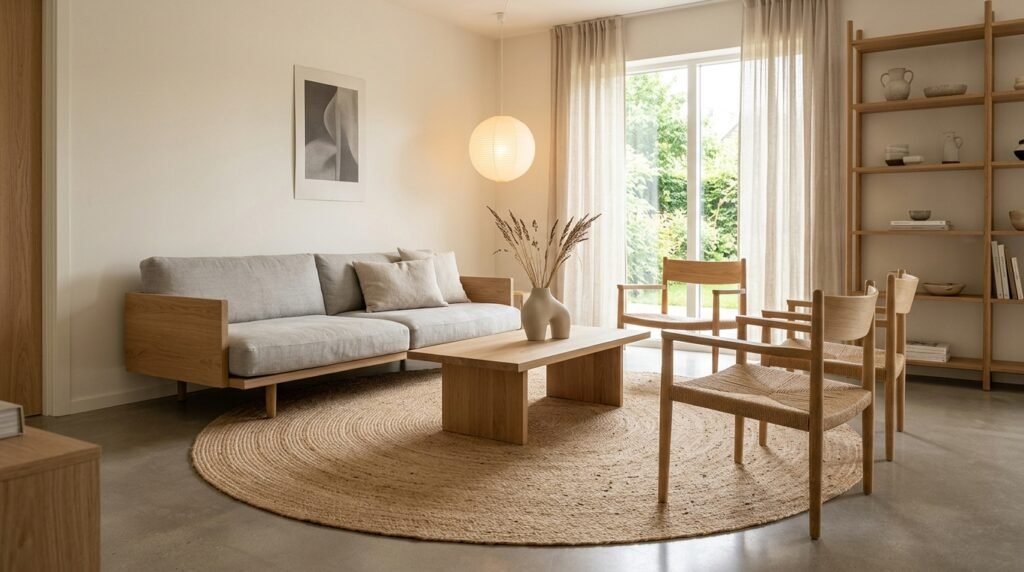 Rugs are a crucial element in Japandi design, helping to define different spaces within an open-plan living room. Choose natural fiber rugs like jute or sisal to add warmth and texture underfoot.