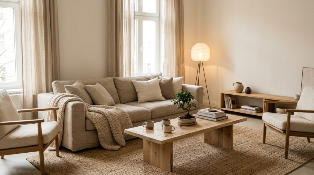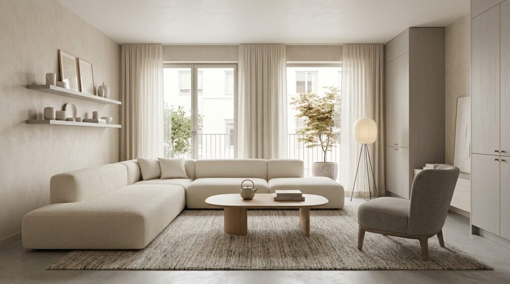 Neutral colors are essential in Japandi design, creating a sense of flow and continuity throughout your living room. Use shades like beige, cream, or grey to create a soothing atmosphere that promotes relaxation.