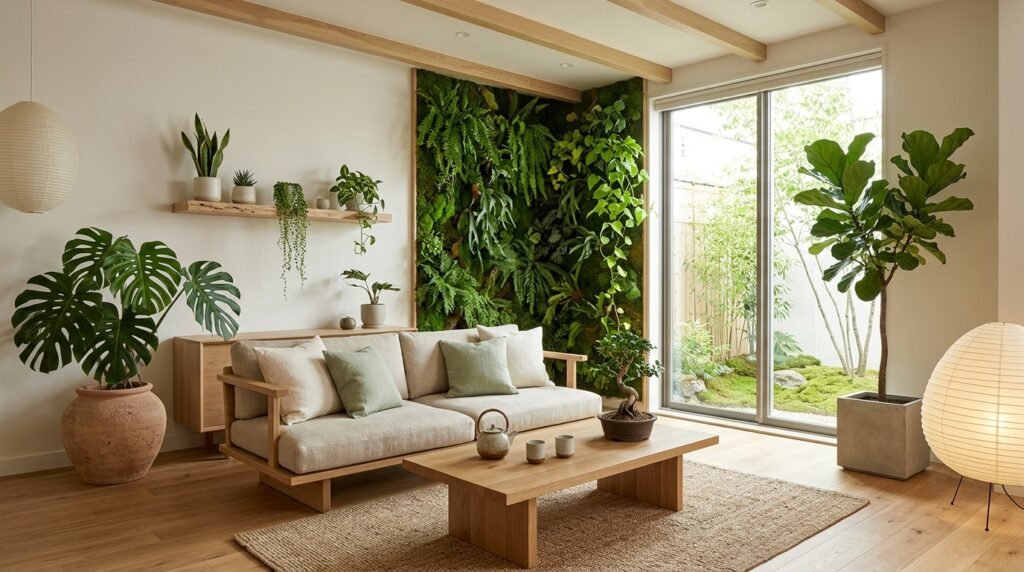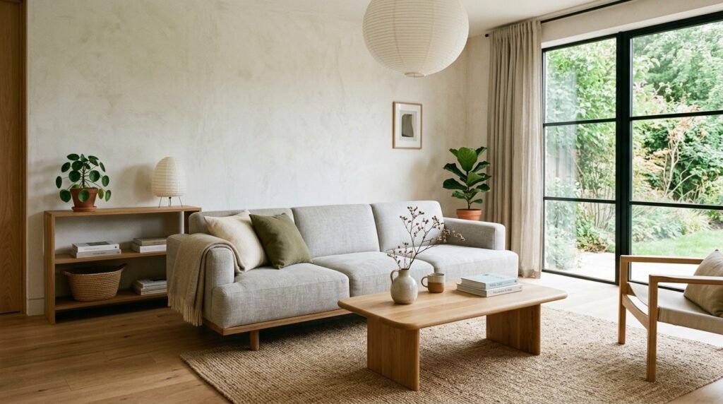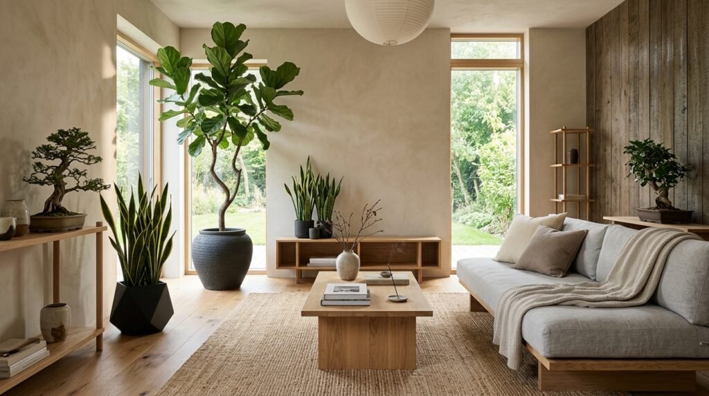 Bringing the outdoors in is essential for a true Japandi living room. Integrate natural elements like plants with strong, sculptural forms, or incorporate nature through materials like oak floors, linen curtains, and wool rugs. This creates a space that feels harmonious with the natural environment, promoting well-being and reducing stress.