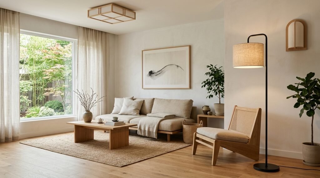 Natural light is a crucial element in Japandi design, creating an airy, open feeling that connects the indoors with the outdoors. To maximize natural light, use sheer curtains and keep window sills uncluttered. For artificial lighting, opt for gentle, ambient light sources like paper lanterns or minimalist floor lamps with fabric shades.