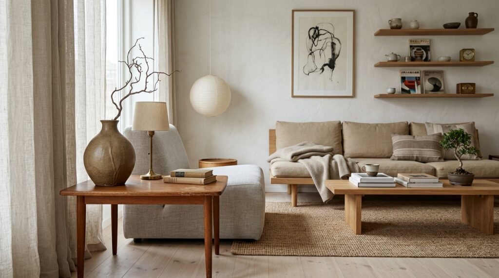 Japandi living room design is deeply rooted in the Japanese concept of wabi-sabi, which is about finding beauty in imperfection, impermanence, and incompleteness. This principle invites you to celebrate the unique character of handmade or vintage items, adding depth and warmth to your space.