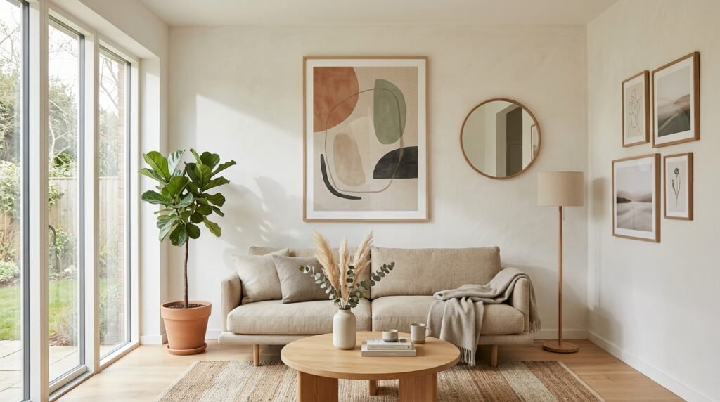 In a Japandi living room, walls are not meant to be covered but rather thoughtfully adorned. Opt for one or two large-scale pieces of art that create a significant impact, complementing the room’s serene atmosphere without overwhelming it. Consider simple, high-quality frames in natural wood tones or slim black frames for a touch of modern contrast.