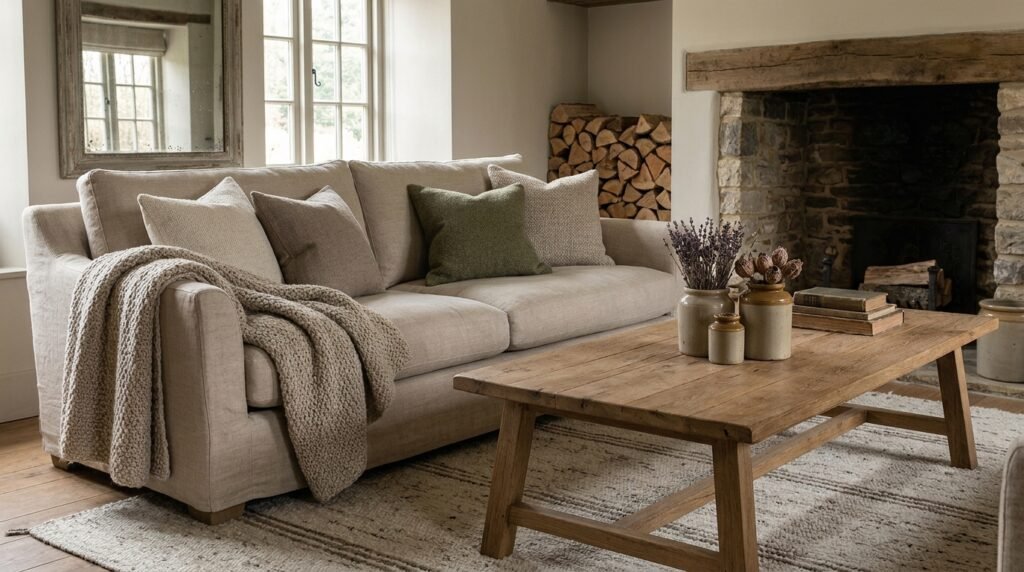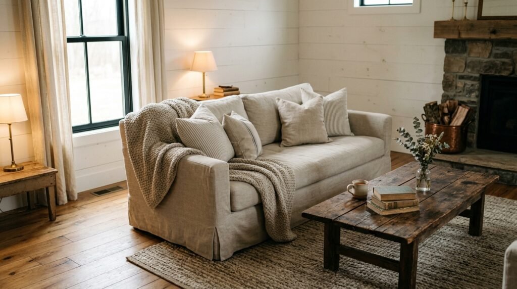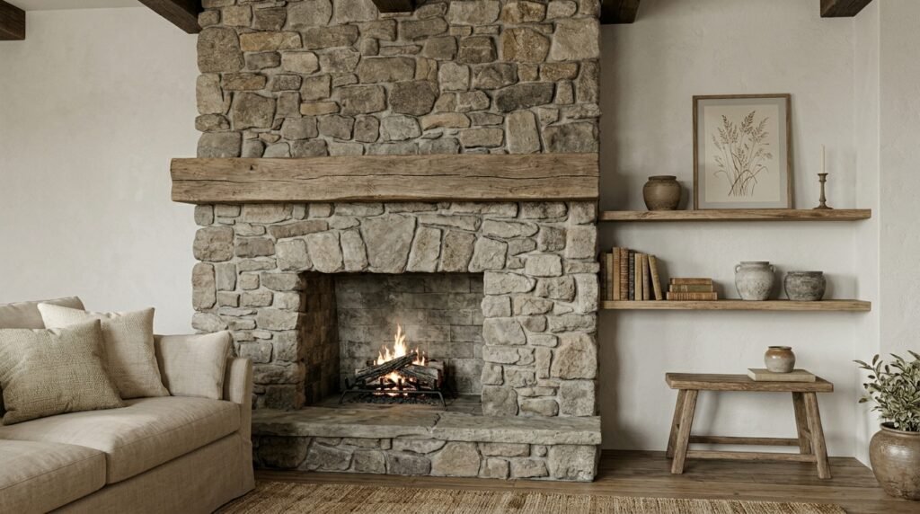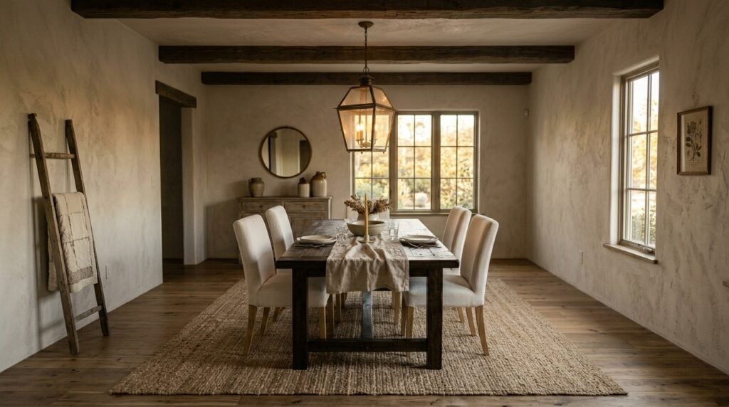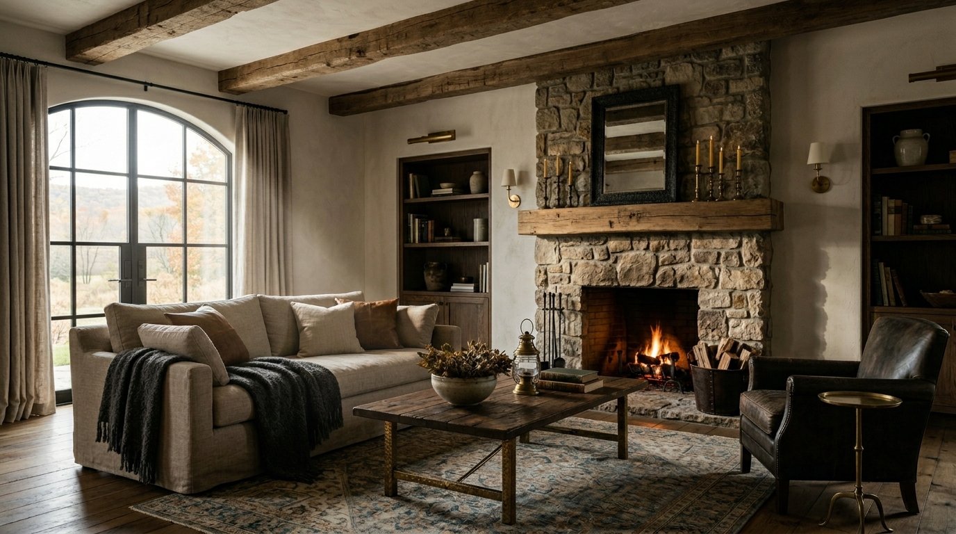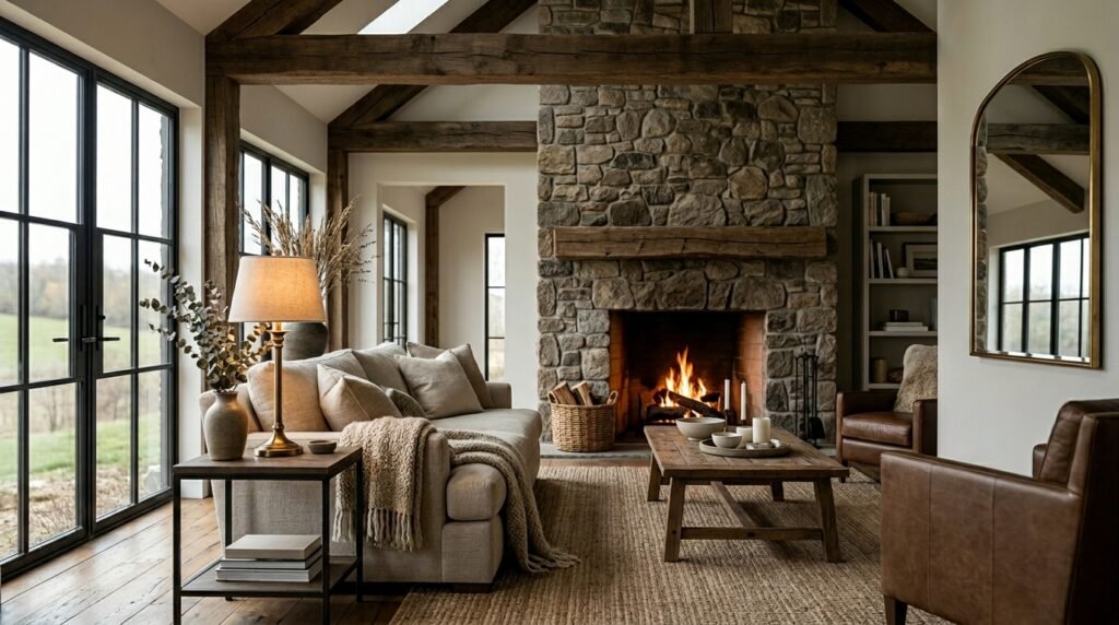 These tones act as a canvas for natural textures such as reclaimed wood, stone fireplaces, and woven baskets. Instead of bold colors, visual interest comes from contrast between materials: smooth plaster walls beside rough timber beams or linen upholstery layered with chunky knit throws.