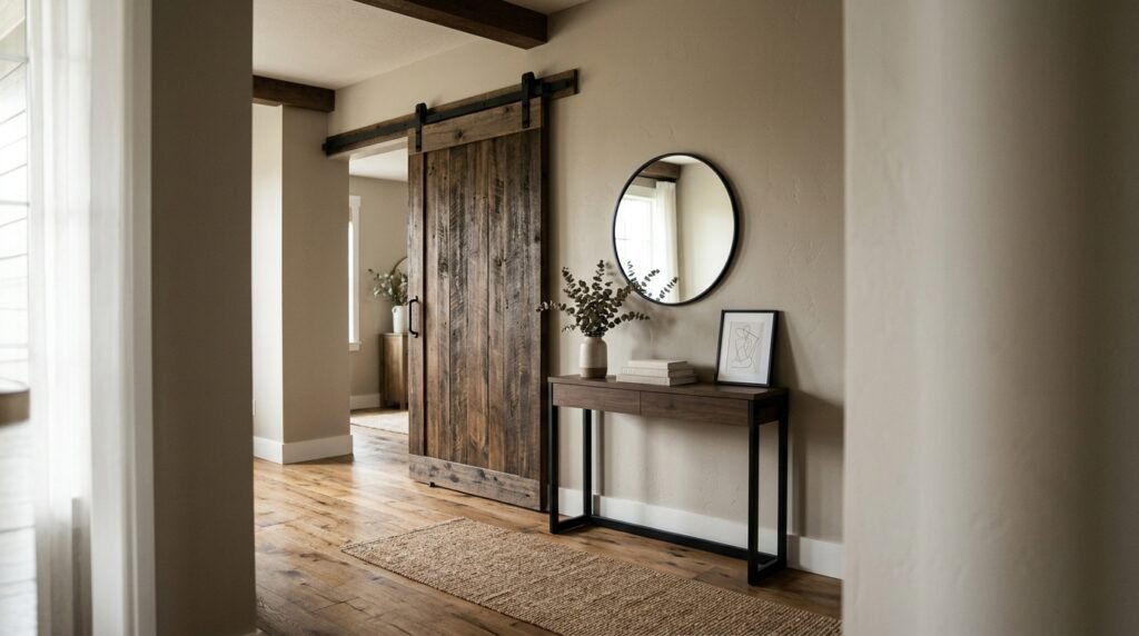 Barn doors bring farmhouse character while saving space.