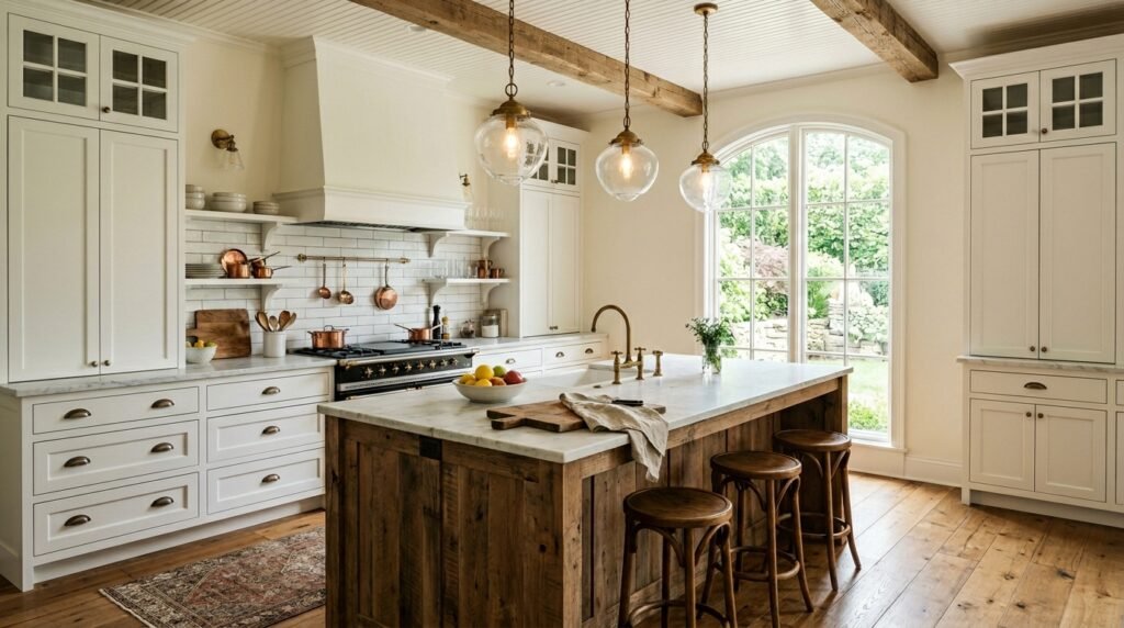 Reclaimed beams add authenticity and visual warmth to modern farmhouse interiors. Salvaged timbers carry natural knots, grain patterns, and subtle imperfections that give rooms a sense of history.