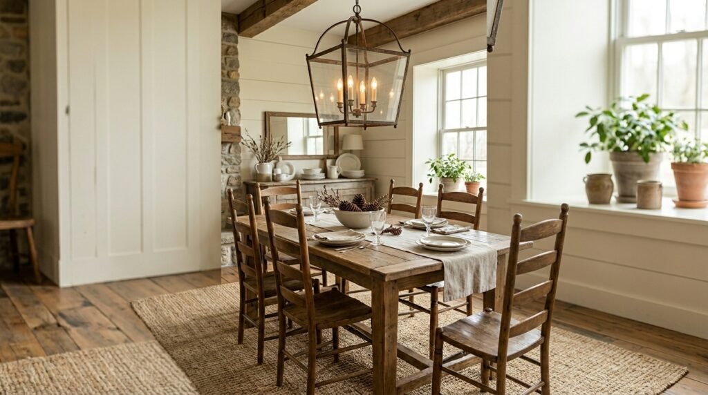 Large wood tables anchor farmhouse dining rooms.