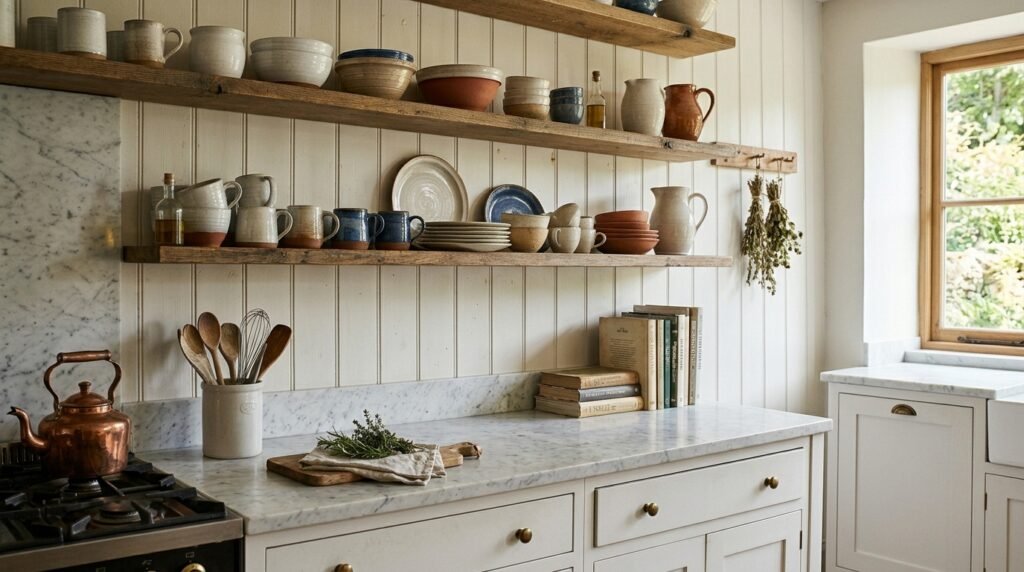 Open shelving introduces warmth and character.