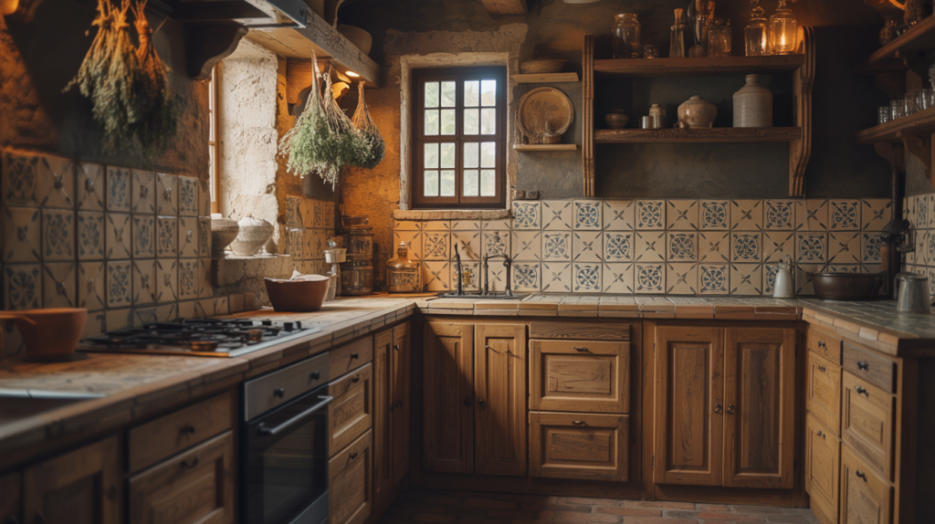 Patterned tiles add charm and character to a moody farmhouse kitchen, perfect for backsplashes in a European-inspired farmhouse. They create a unique and inviting atmosphere.