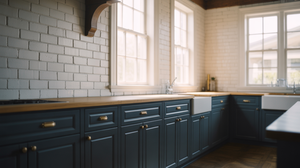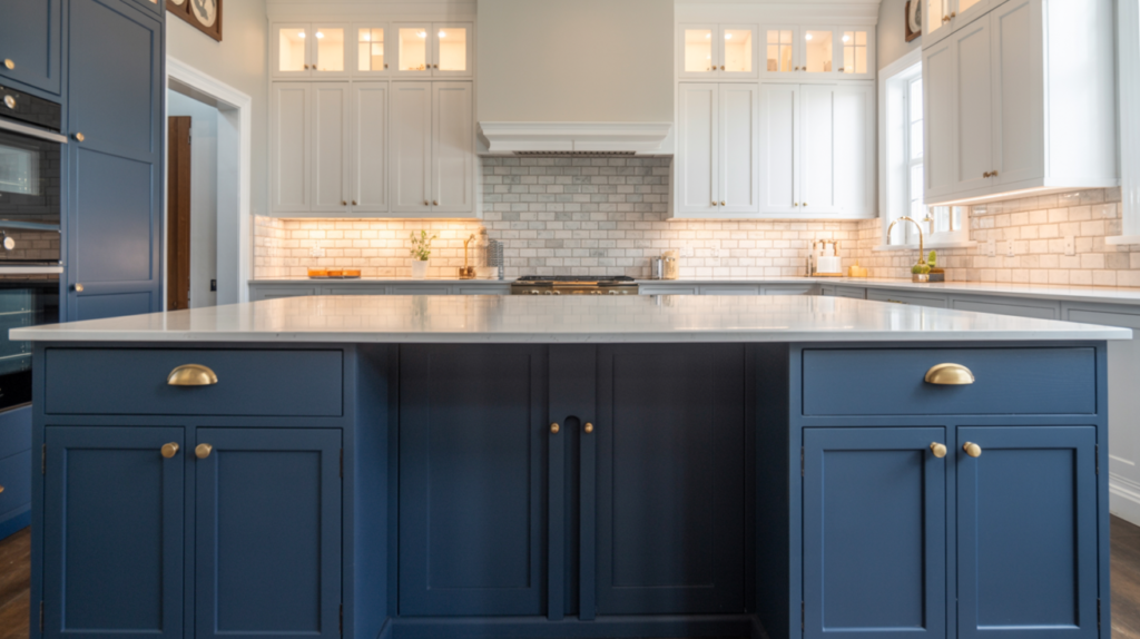 Deep navy blue is both bold and calming, adding depth to your kitchen while keeping things classic. Pair it with white walls or a light backsplash for balance. This design approach also works perfectly for a moody dining room.