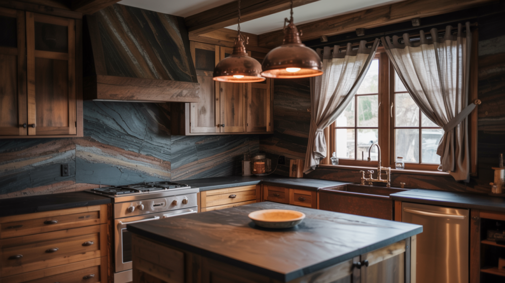 Marble or stone backsplashes bring natural texture to a moody farmhouse kitchen. Darker varieties fit perfectly in a moody farmhouse theme, and opting for a honed finish creates a softer, matte look.