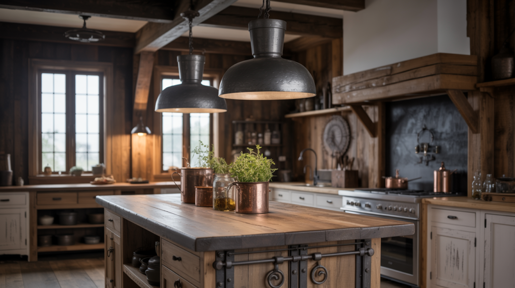 Reclaimed wood cabinets bring warmth and character to a moody farmhouse kitchen, perfect for adding an authentic farmhouse vibe. Mixing them with modern lighting adds a fresh twist to the classic look.