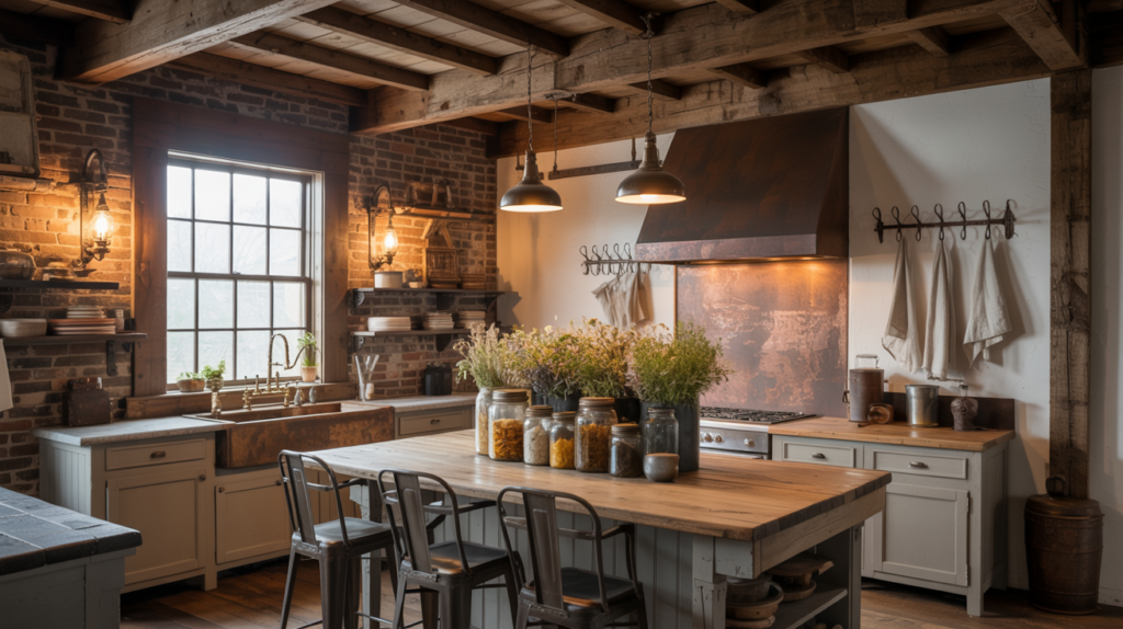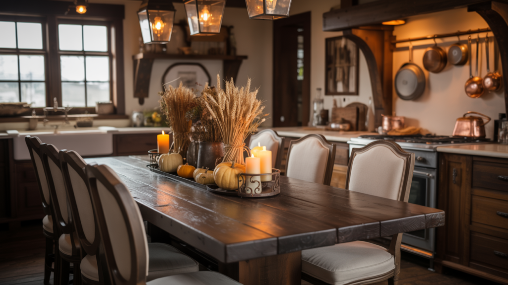 A dark wood farmhouse table is a centerpiece in a moody kitchen, perfect for family gatherings. Adding upholstered chairs or a bench adds extra comfort and style.
