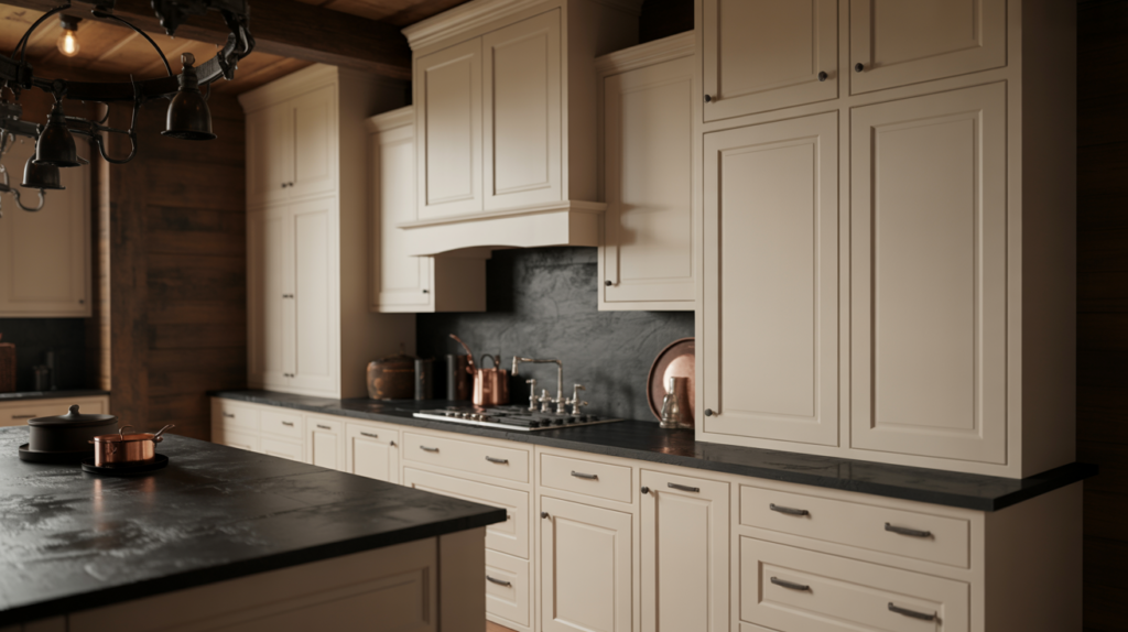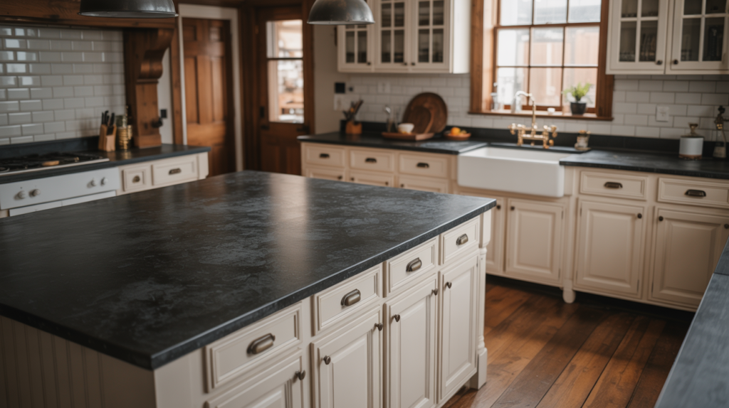 Dark countertops add drama, while white cabinets keep things fresh. This classic combo is both timeless and stylish, a perfect choice for a moody farmhouse kitchen.
