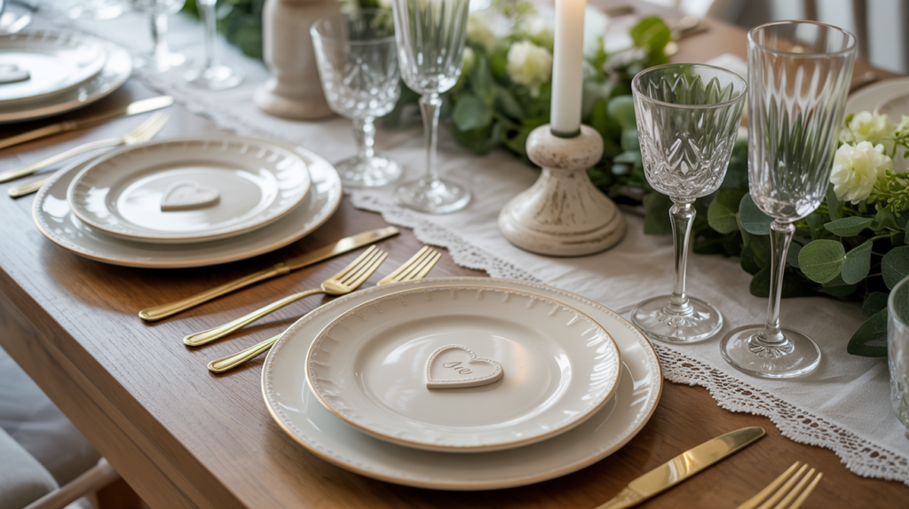Your table gets all dressed up for date night with delicate lace runners, antique-inspired plates, and a little sparkle from cut glass. Soft candlelight and heart-shaped details take you to another era.