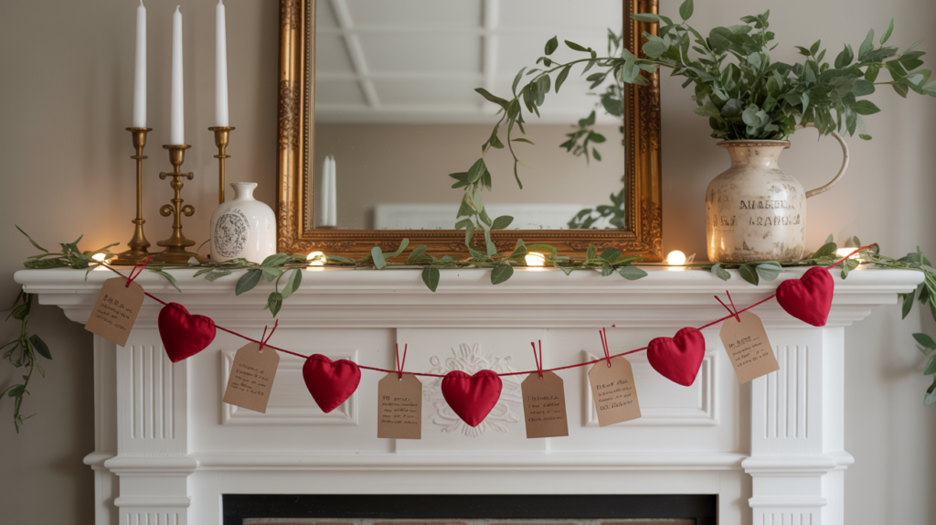 Lean into the vintage valentines aesthetic by mixing heart garlands, faded paper tags, and little antique vases, and maybe even a few brass candlesticks.