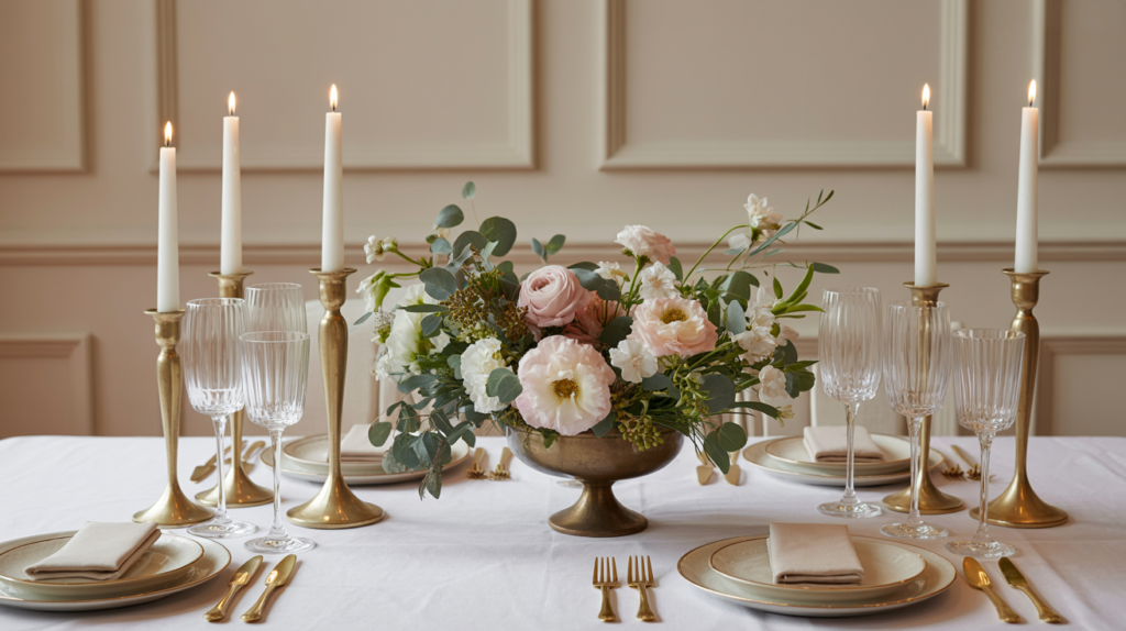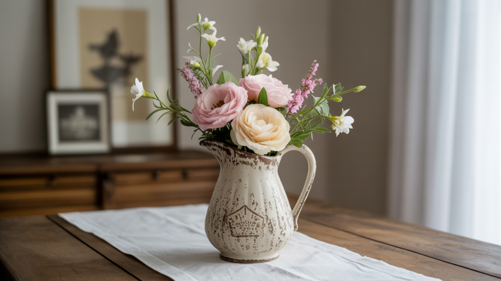 Nothing feels more romantic than a table with flowers, but this version brings in that nostalgic charm. Use a soft, vintage pitcher or an aged vase as your base and fill it with faux or fresh florals in pinks, whites, and mauves.